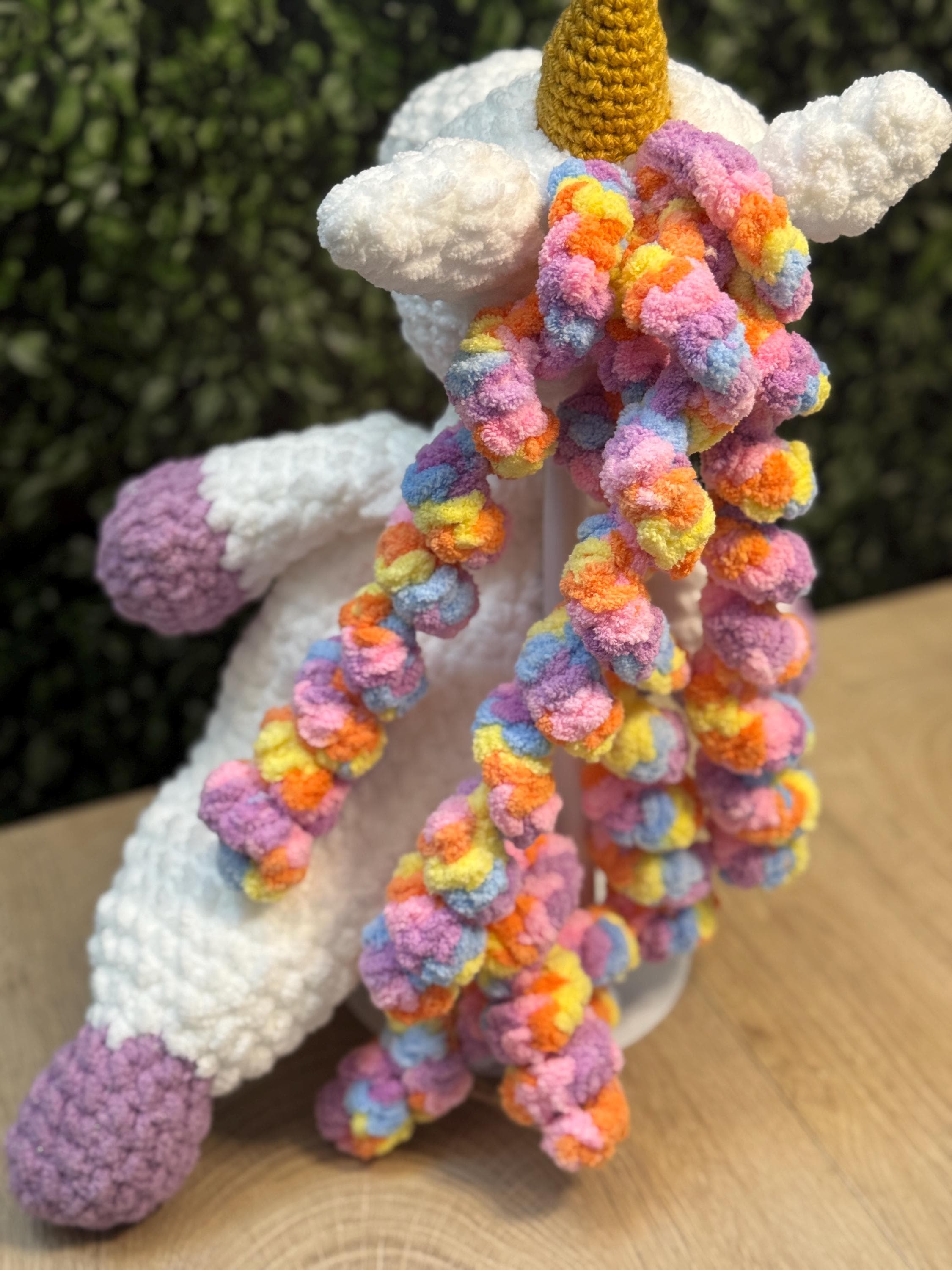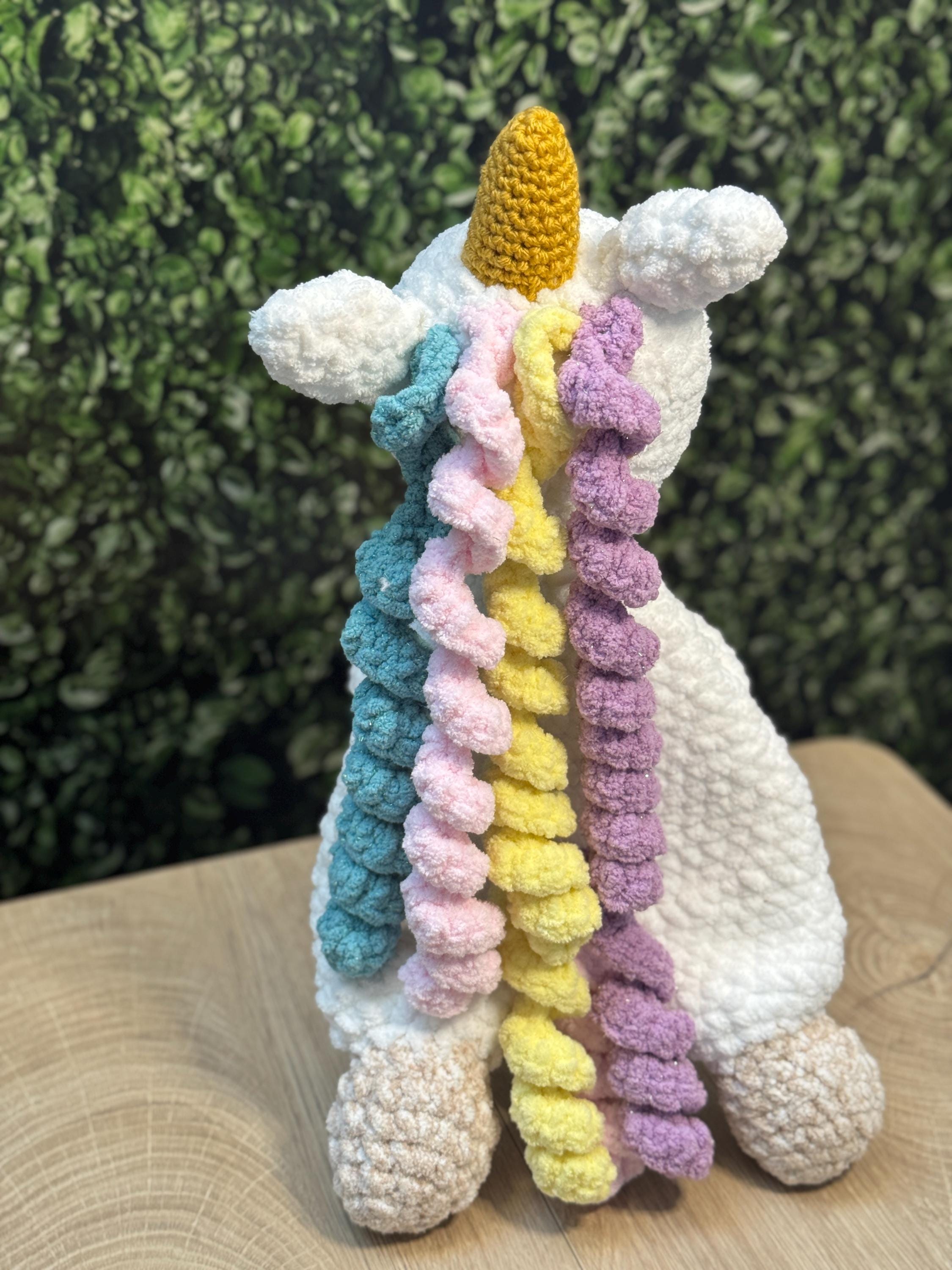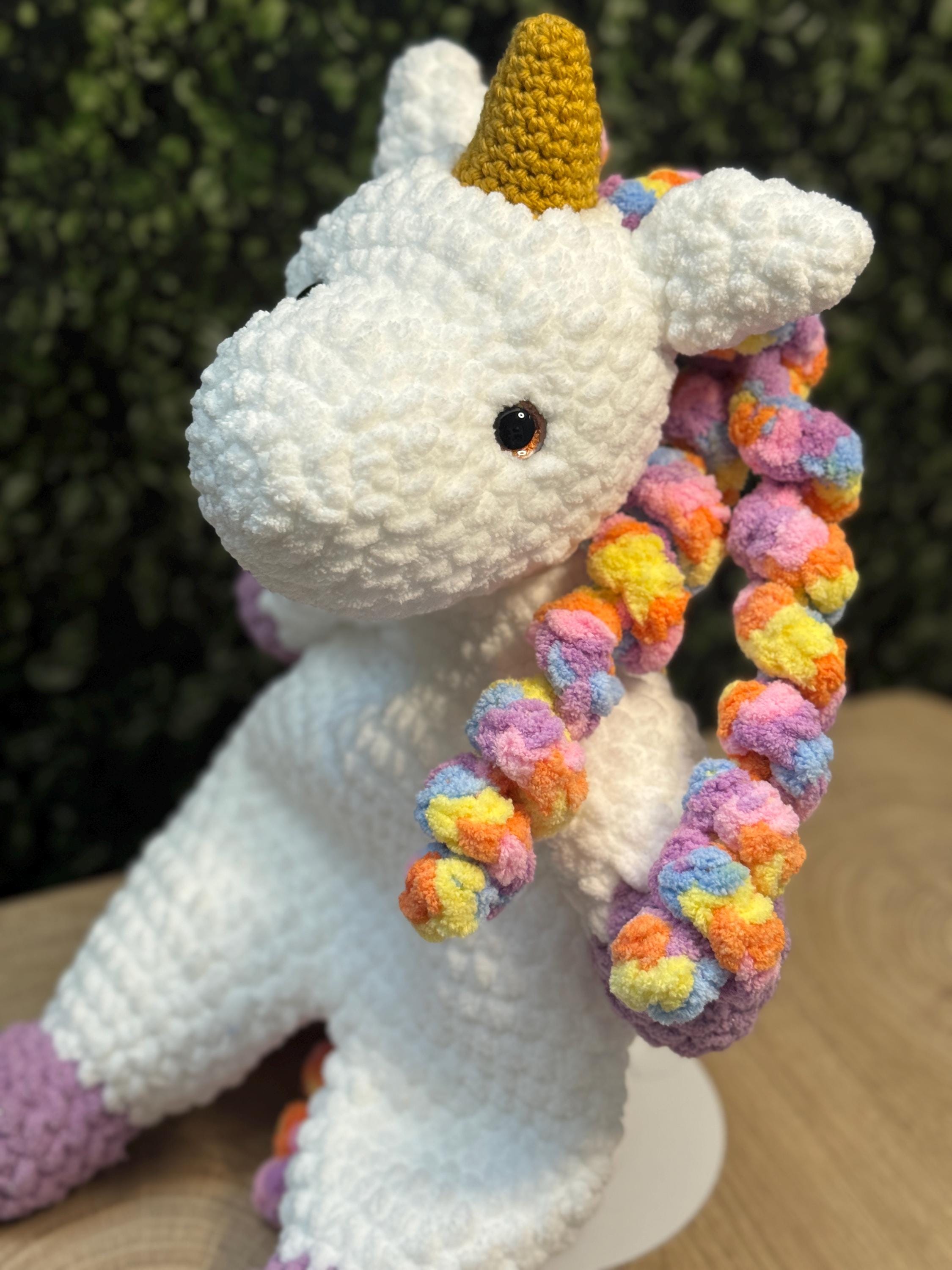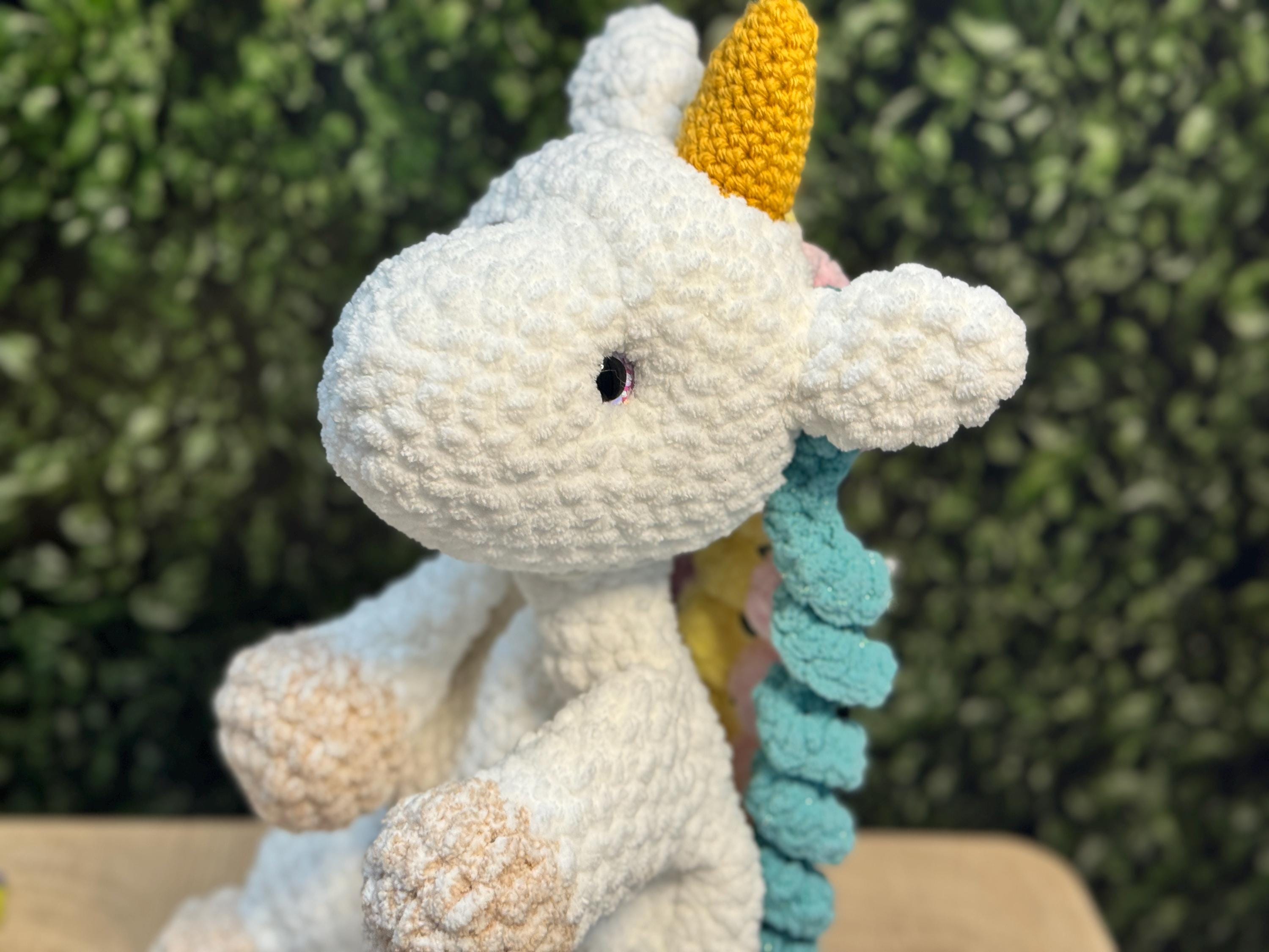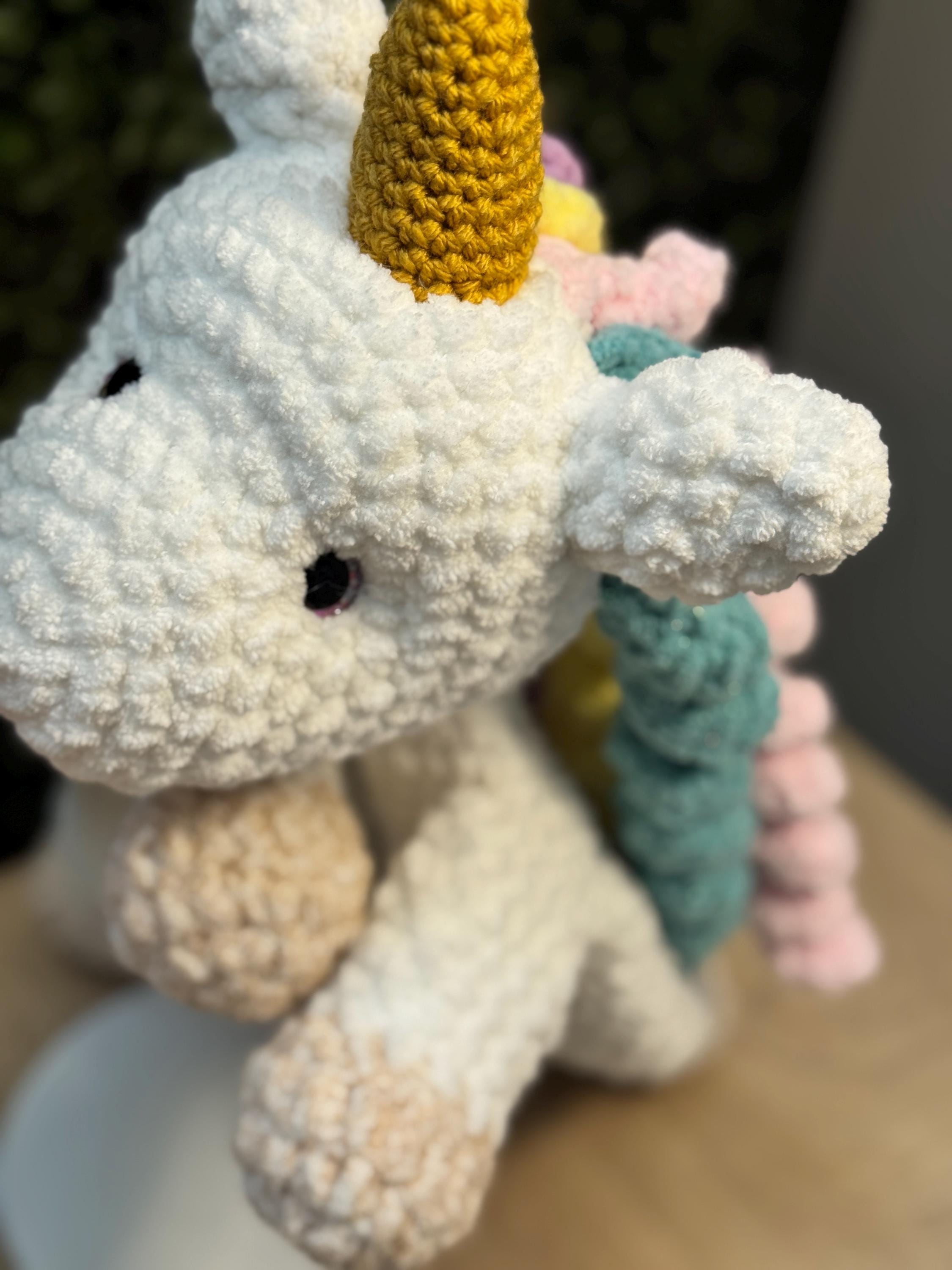 🧼 Care Instructions • Spot clean with a damp cloth and mild soap • Do not machine wash or tumble dry (to protect the yarn and safety eyes) • Gently reshape while damp if needed • Keep away from pets that may chew on plush items • For longevity, avoid excessive pulling on the horn or mane