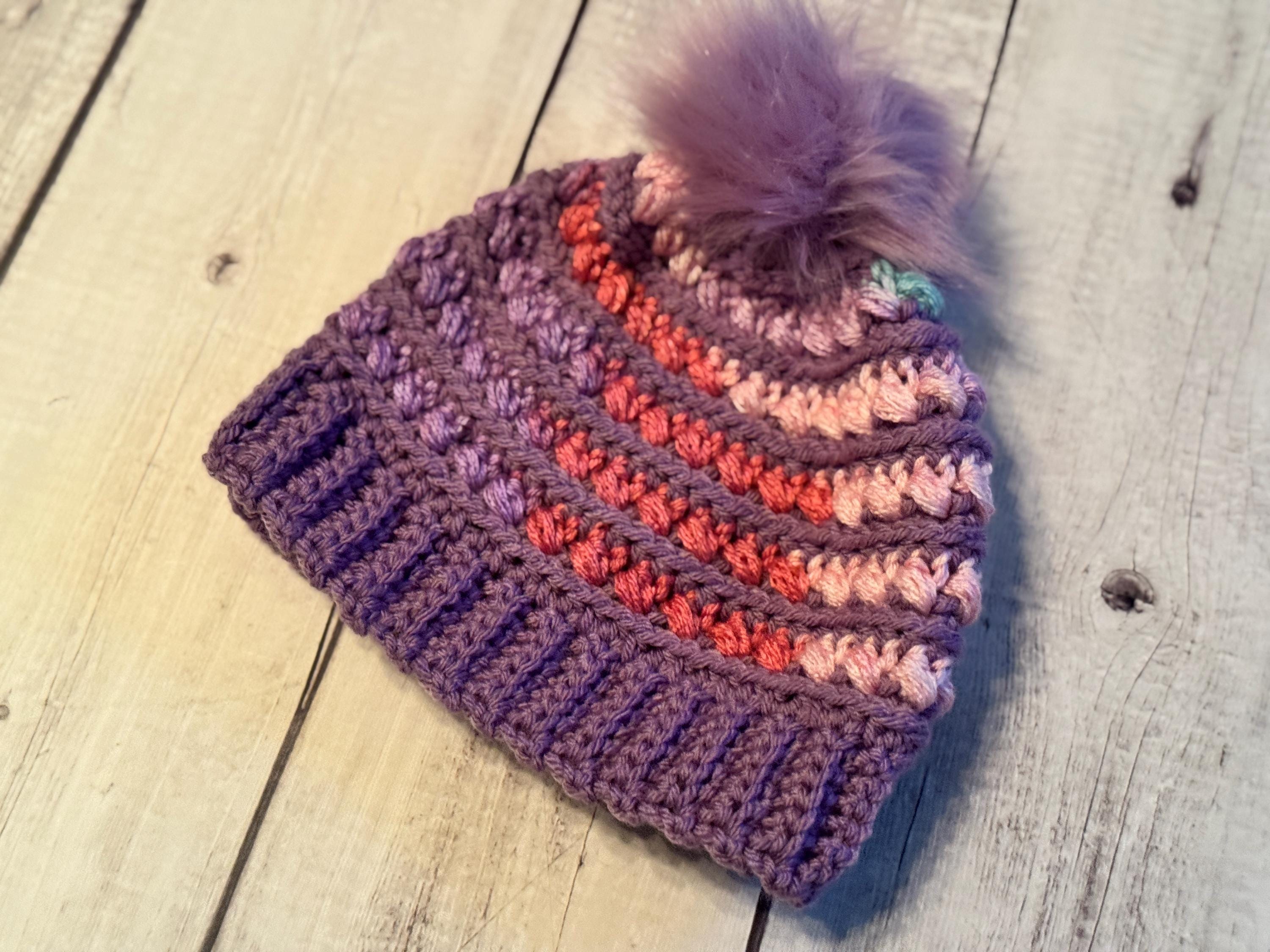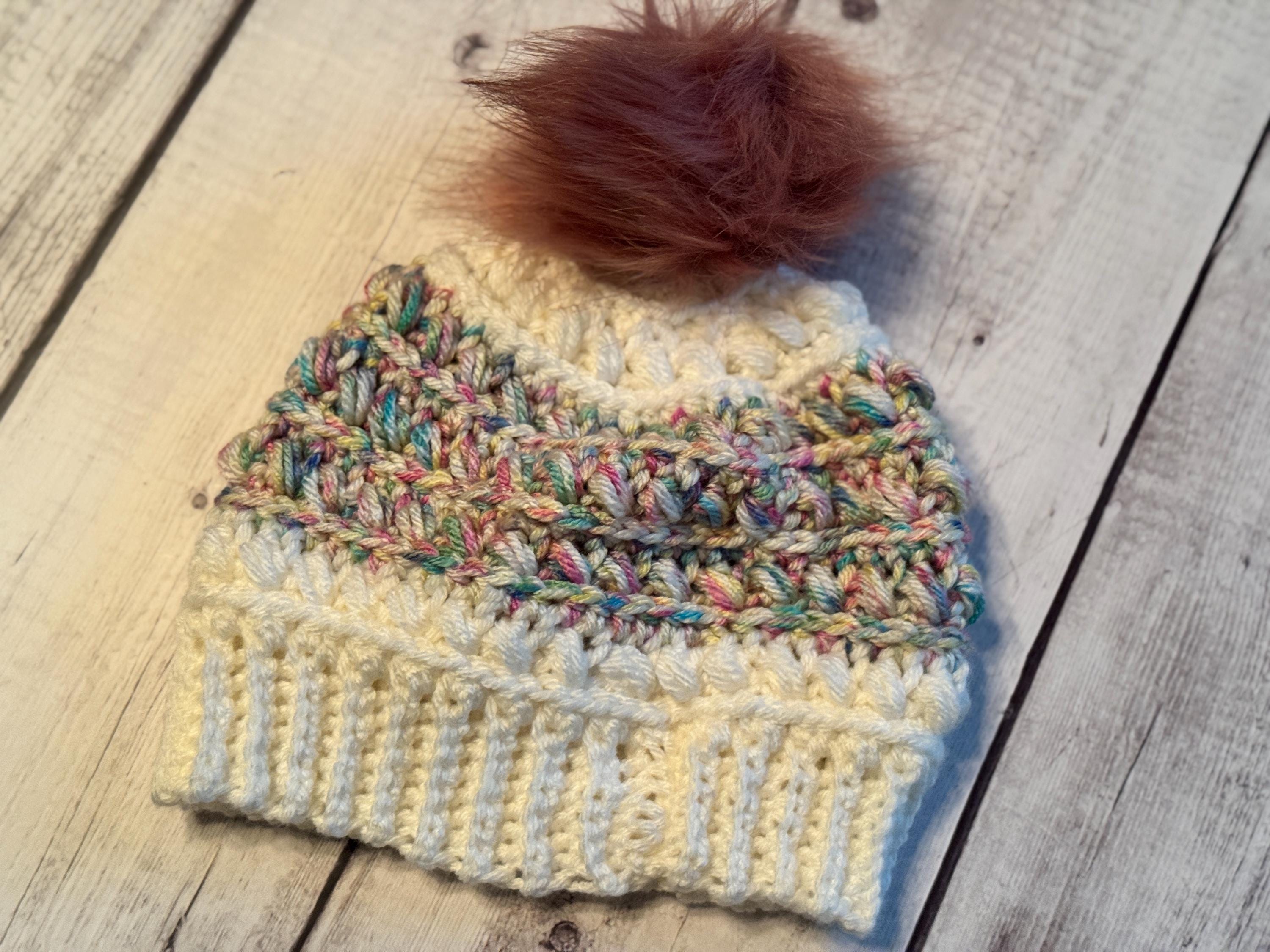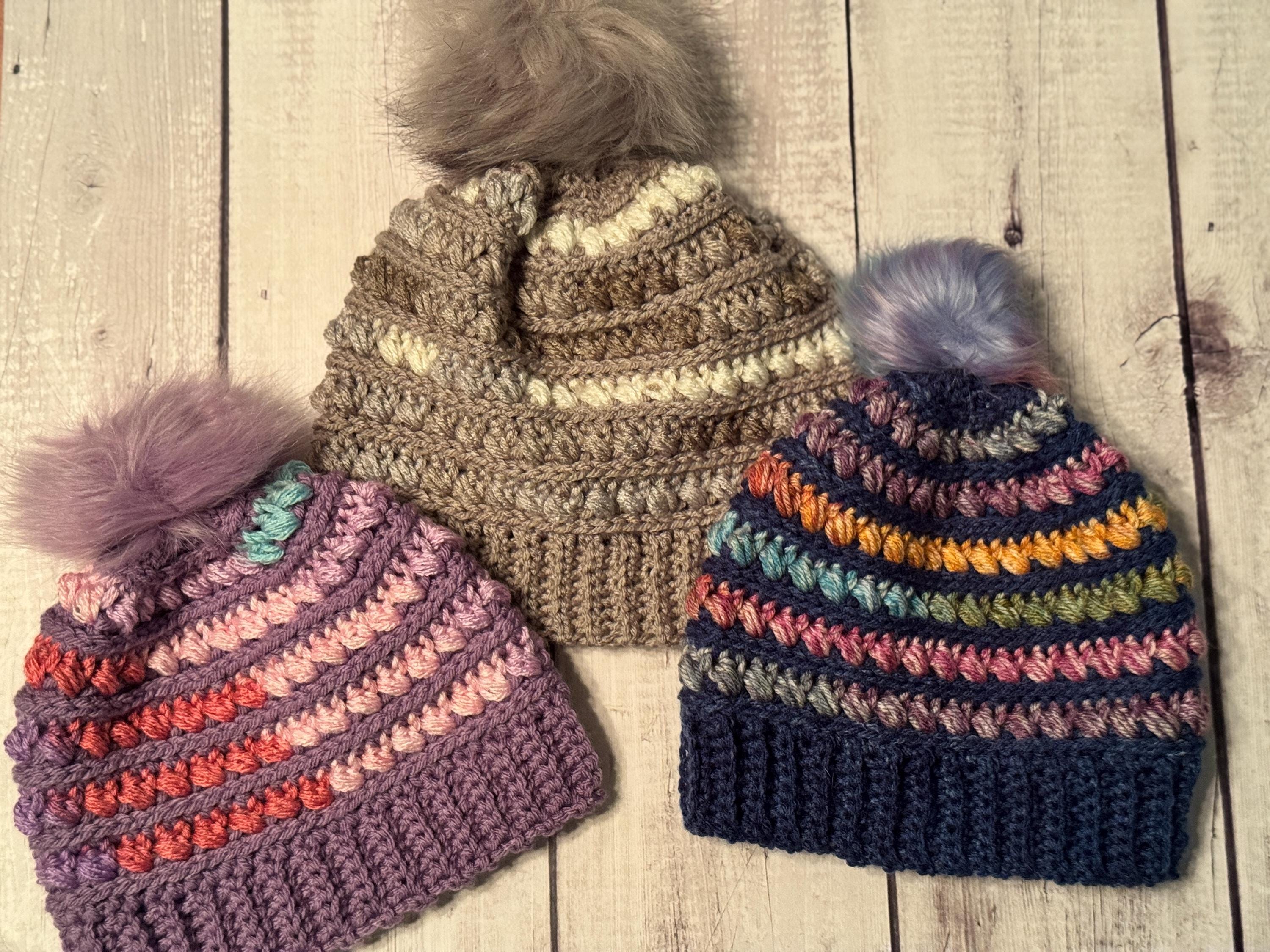 ✨ Features ✨ * **Handmade Physical Beanie:** Each beanie is carefully crocheted and ready to wear, not a digital pattern. * **Textured Puff Stitches:** Every other row is worked in puff stitches for a plush, cozy look. * **Two Color Variations:** -3-Color Beanie:** Features three complementary colors for a fun, vibrant winter look. -Accent Color Beanie:** Neutral base with a pop of accent color for a subtle, stylish touch.